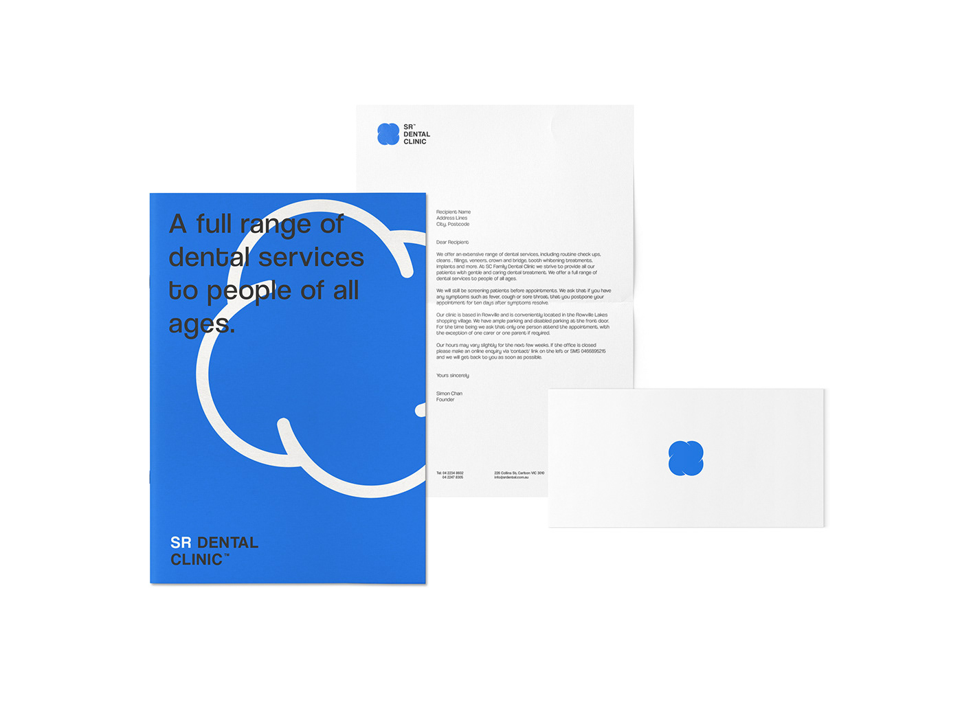 最后,圍繞簡潔的圖形建立了一個品牌形象設(shè)計,采用明亮的醫(yī)用藍色、俯視圖上一顆臼齒的抽象形狀和現(xiàn)代身份識別系統(tǒng),可以成功地應(yīng)用于古典和數(shù)字通信。