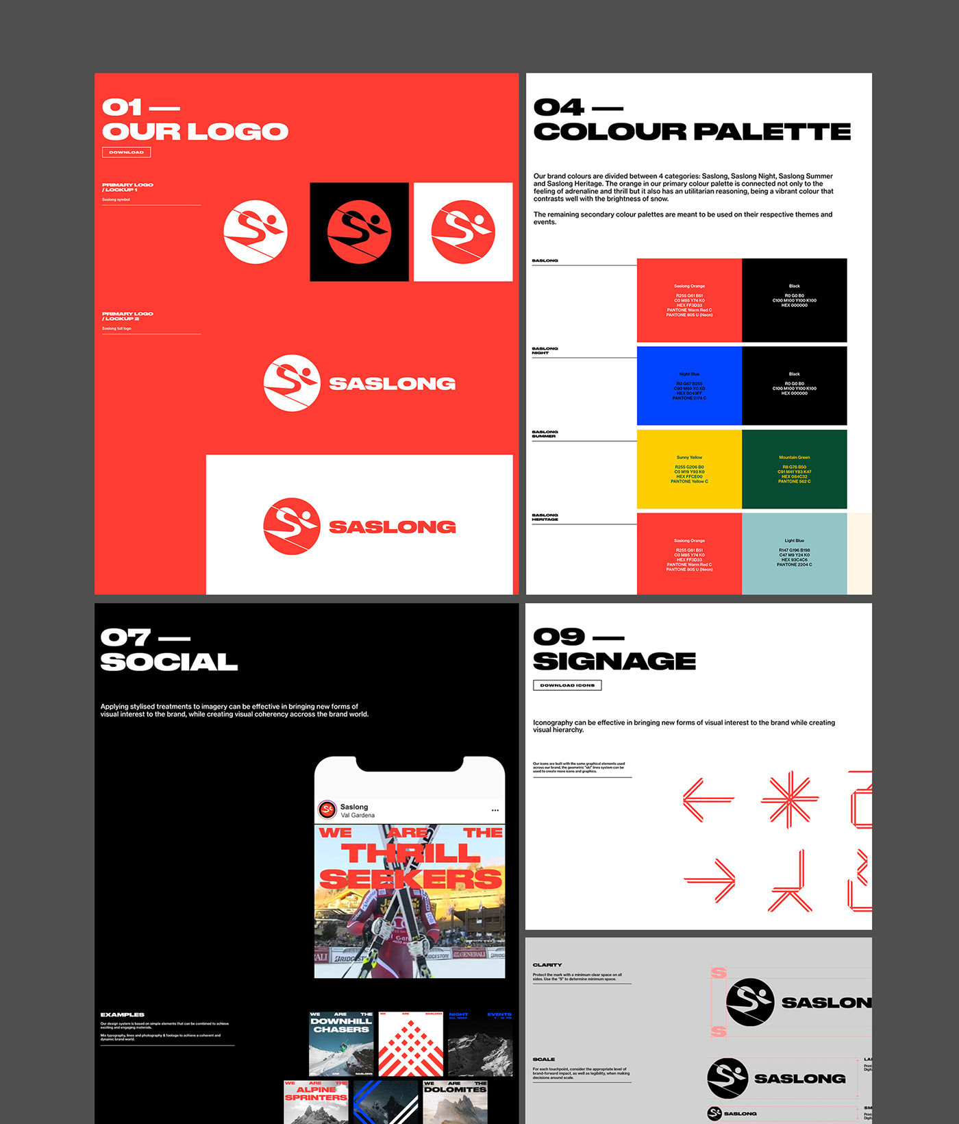 原始標(biāo)志的傳統(tǒng)在新的重新設(shè)計的標(biāo)志中得以保留,設(shè)計不僅存在于物理媒體上,也存在于數(shù)字屏幕上。品牌語言的靈感來自滑雪者的動作和雪道,以鮮艷的橙色為特色,在明亮的雪地上突顯出來。Saslong design system捕捉了滑雪運動中最具標(biāo)志性的運動之一——障礙滑雪,其特點是滑雪桿之間呈之字形或波浪形,滑雪者在雪地上留下的軌跡產(chǎn)生了動態(tài)形狀,這些動態(tài)形狀被完全采納為品牌形象設(shè)計中,用于靜態(tài)和動態(tài)應(yīng)用中。