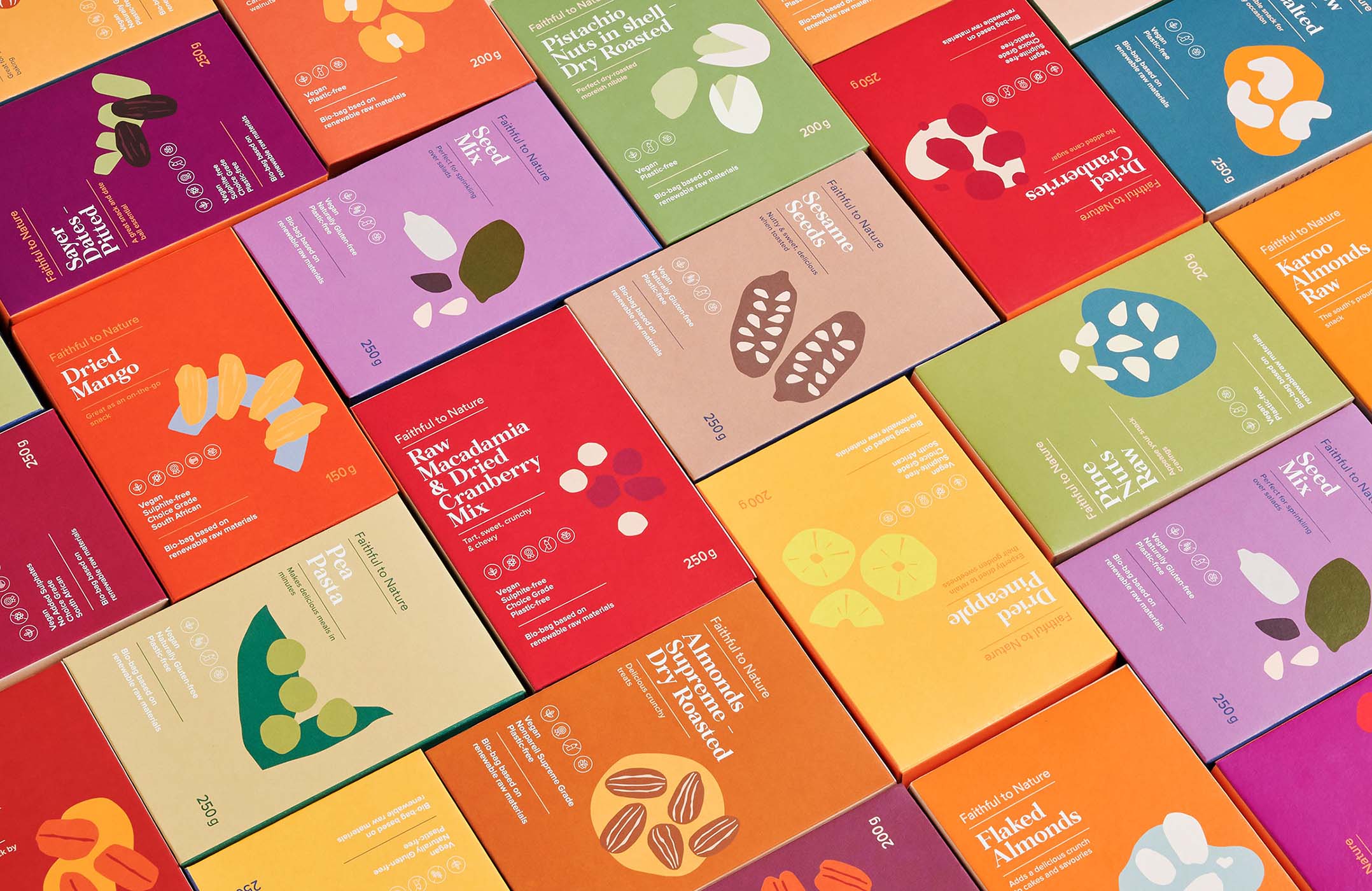 共同的元素,如標(biāo)志設(shè)計定位,字體和標(biāo)題層次仍然貫穿于所有產(chǎn)品,以創(chuàng)造一致性,跨越所有范圍,并喚起品牌認(rèn)知度。包裝設(shè)計忠實于大自然的標(biāo)志性無廢料包裝,有環(huán)境之心。儲藏室的貨物都是用植物纖維素制成的袋子,F(xiàn)SC認(rèn)證的盒子里印著植物用的墨水.所有忠實的自然紙箱是100%堆肥。