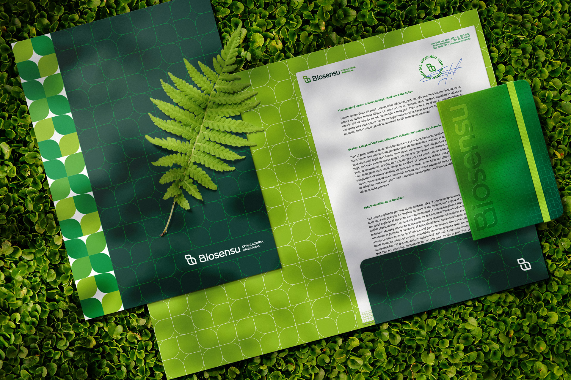 標(biāo)識設(shè)計(jì)中需要呈現(xiàn)的屬性是:現(xiàn)代、系列、精致和有機(jī),并且還要求使用綠色(最終分解為具有各種深淺綠色的彩色調(diào)色板)。品牌形象設(shè)計(jì)是設(shè)計(jì)一個具有足夠強(qiáng)烈個性的符號和排版,可以一起使用或單獨(dú)使用,此外,還可以從美學(xué)角度參考該公司的細(xì)分市場:環(huán)境咨詢/自然/樹葉。該標(biāo)志設(shè)計(jì)源于葉子+字母B(公司的首字母)的設(shè)計(jì),具有有機(jī)的美學(xué)和顯著的特征,即一些圓滿的結(jié)尾,而另一些則更直。這一特點(diǎn)激發(fā)了排版設(shè)計(jì)的靈感,這是一種專為e Biosensu設(shè)計(jì)的無襯線字體,具有足夠的個性,可以在沒有符號的情況下使用。同樣的視覺特征也存在于一些文具中,如名片、信封等。