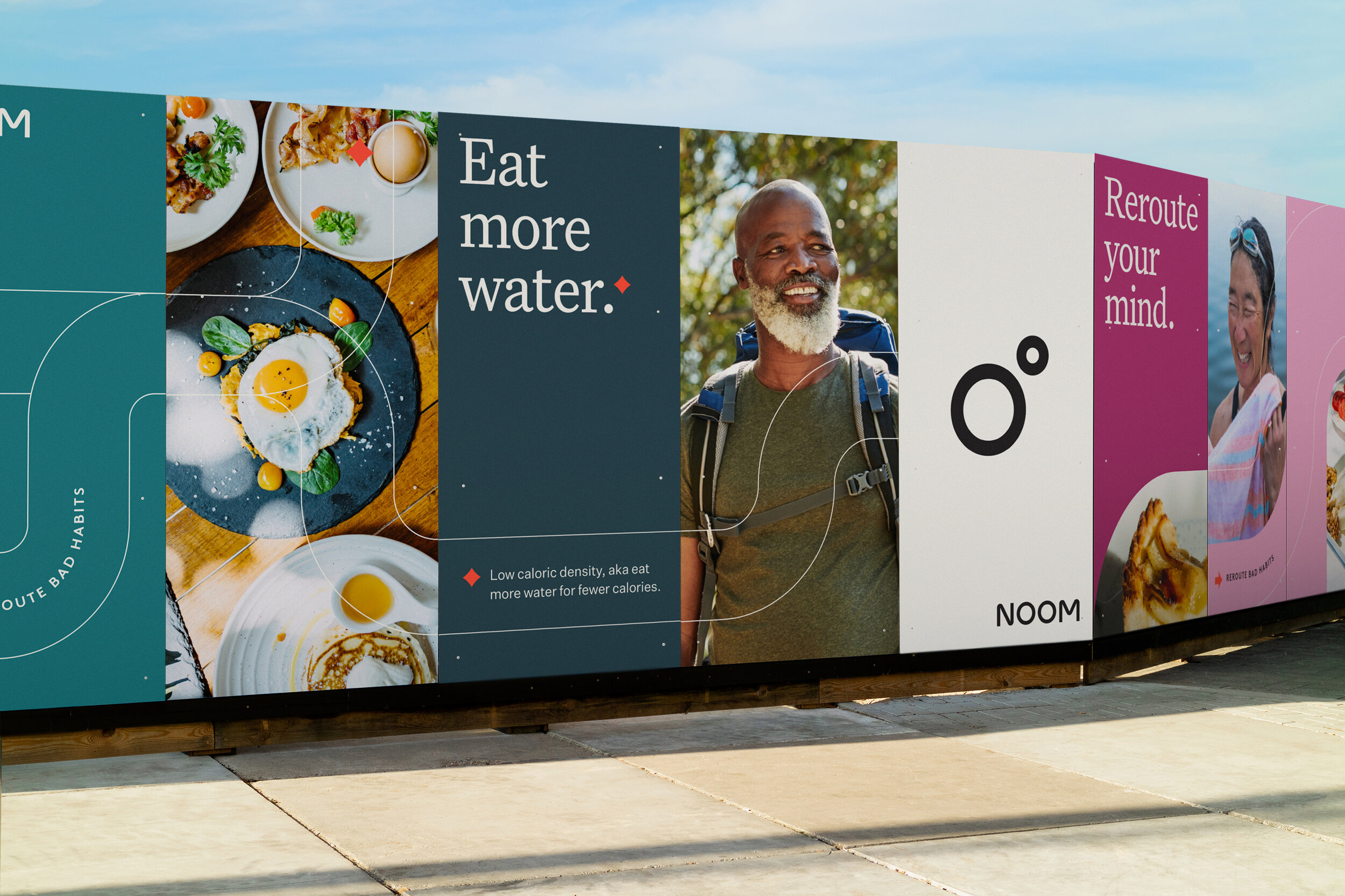 該系列調(diào)色板的靈感來自我們周圍的世界——從美味水果和蔬菜的豐富色調(diào)到郁郁蔥蔥的風景和舒緩的紋理。一系列圖形標記旨在引導觀眾的眼睛,一個強大的布局系統(tǒng)告知從攝影到信息的每個元素如何協(xié)同工作。我們設計了一種拼貼方法和建造指南,為Noom品牌設計的心理學支持的課程創(chuàng)建插圖,這在新的應用程序和網(wǎng)站設計中得到了利用。