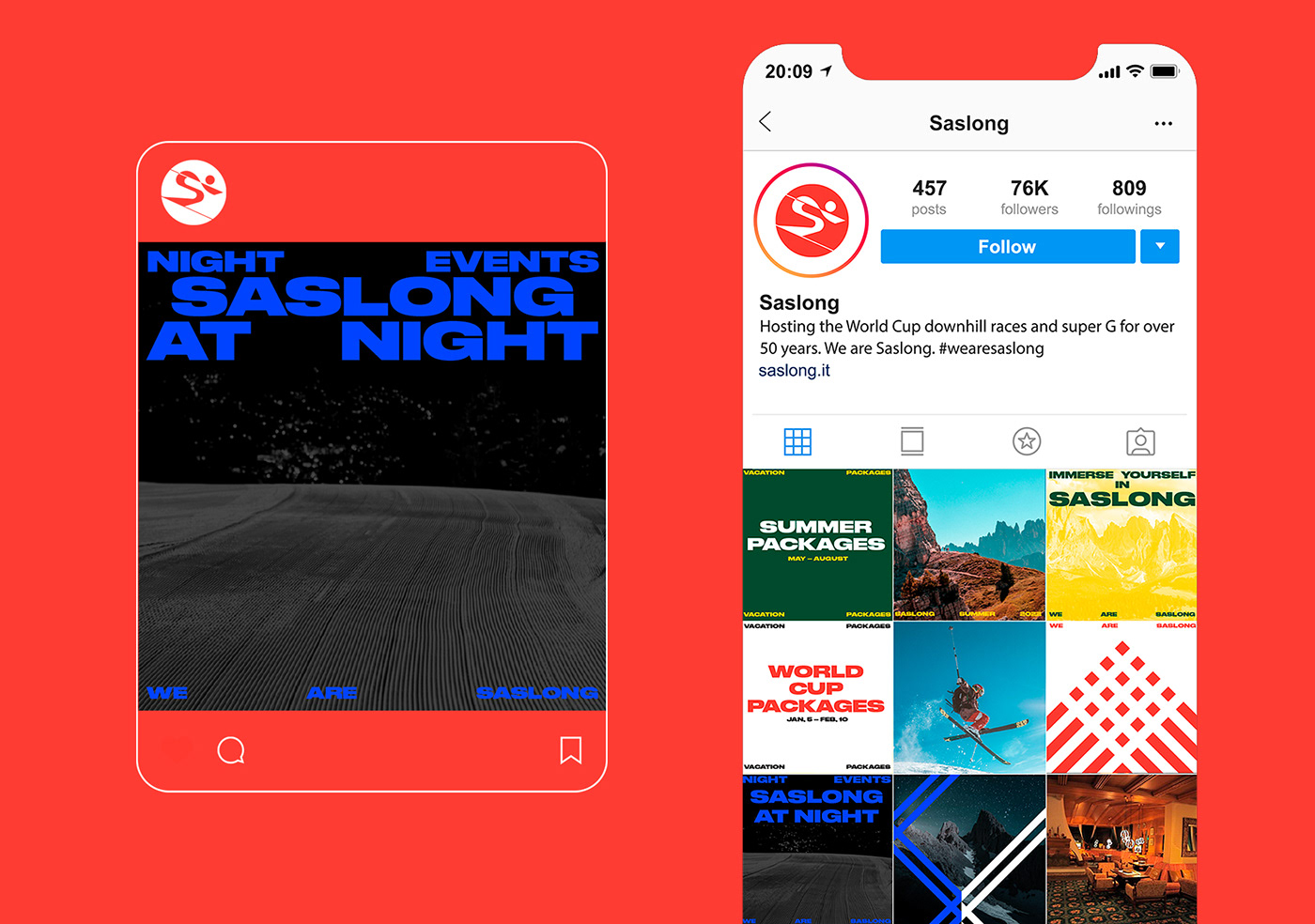 原始標(biāo)志的傳統(tǒng)在新的重新設(shè)計的標(biāo)志中得以保留,設(shè)計不僅存在于物理媒體上,也存在于數(shù)字屏幕上。品牌語言的靈感來自滑雪者的動作和雪道,以鮮艷的橙色為特色,在明亮的雪地上突顯出來。Saslong design system捕捉了滑雪運動中最具標(biāo)志性的運動之一——障礙滑雪,其特點是滑雪桿之間呈之字形或波浪形,滑雪者在雪地上留下的軌跡產(chǎn)生了動態(tài)形狀,這些動態(tài)形狀被完全采納為品牌形象設(shè)計中,用于靜態(tài)和動態(tài)應(yīng)用中。