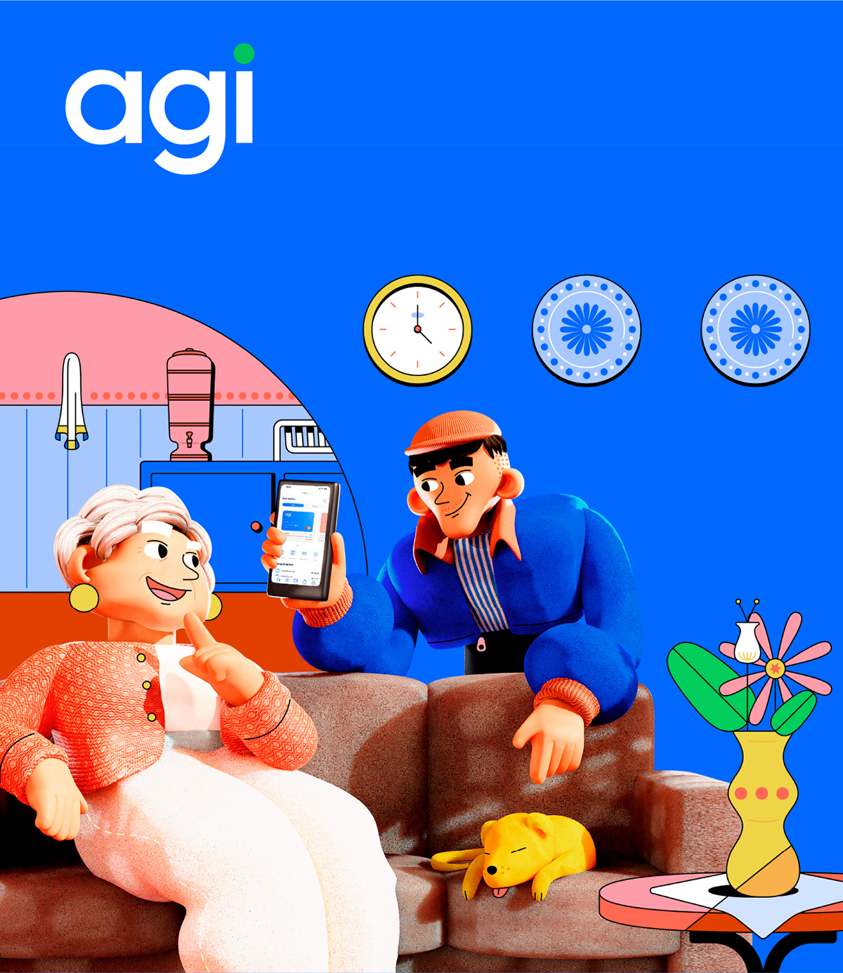 我們在調色板中添加了暖色,以補充該品牌傳統的藍色和綠色,表達該品牌客戶服務和語氣中的人性溫暖。圖標系列旨在以一種有趣而簡單的方式總結Agi提供的服務。