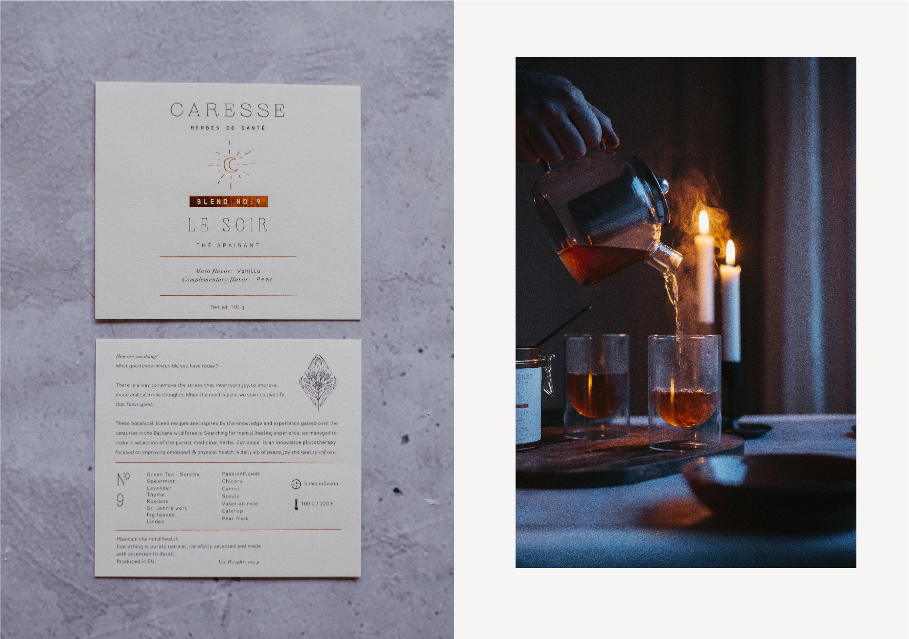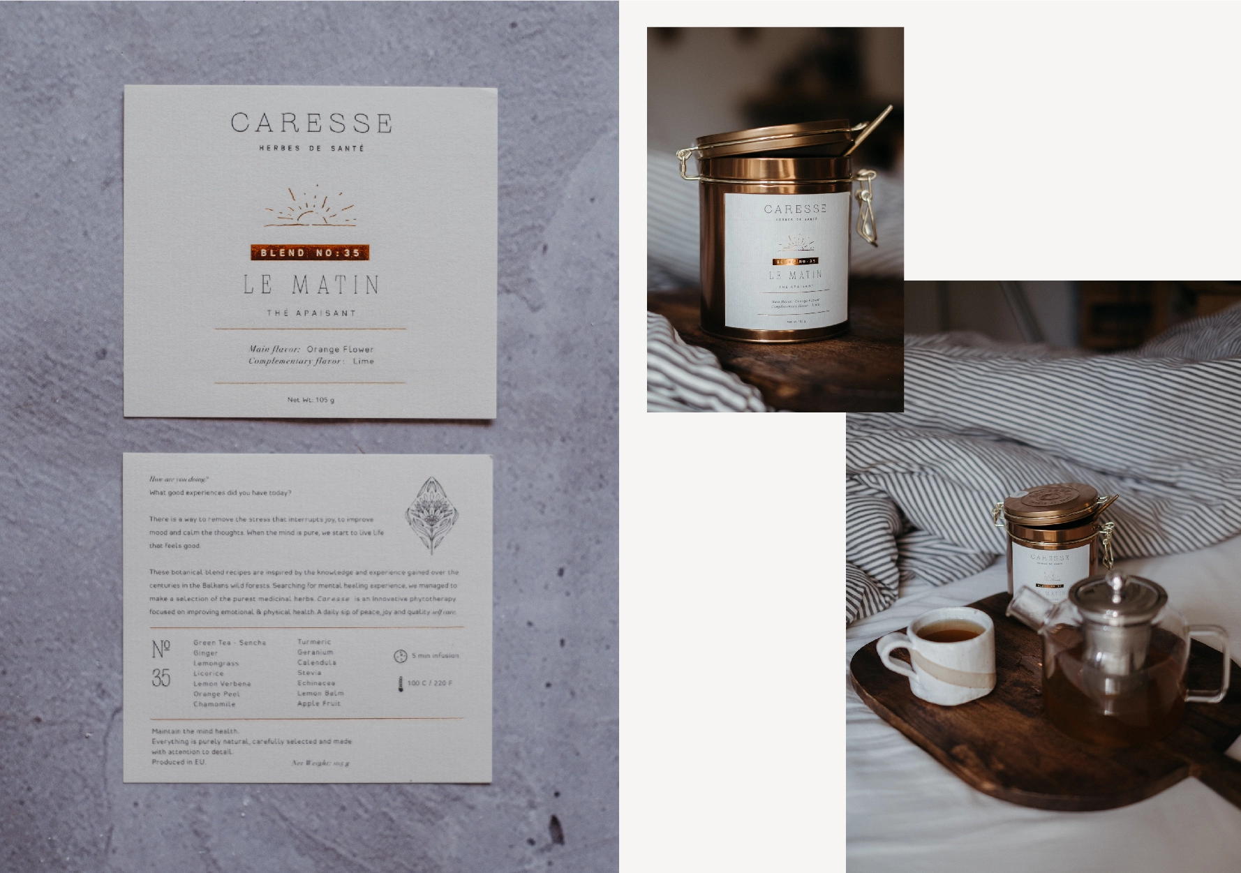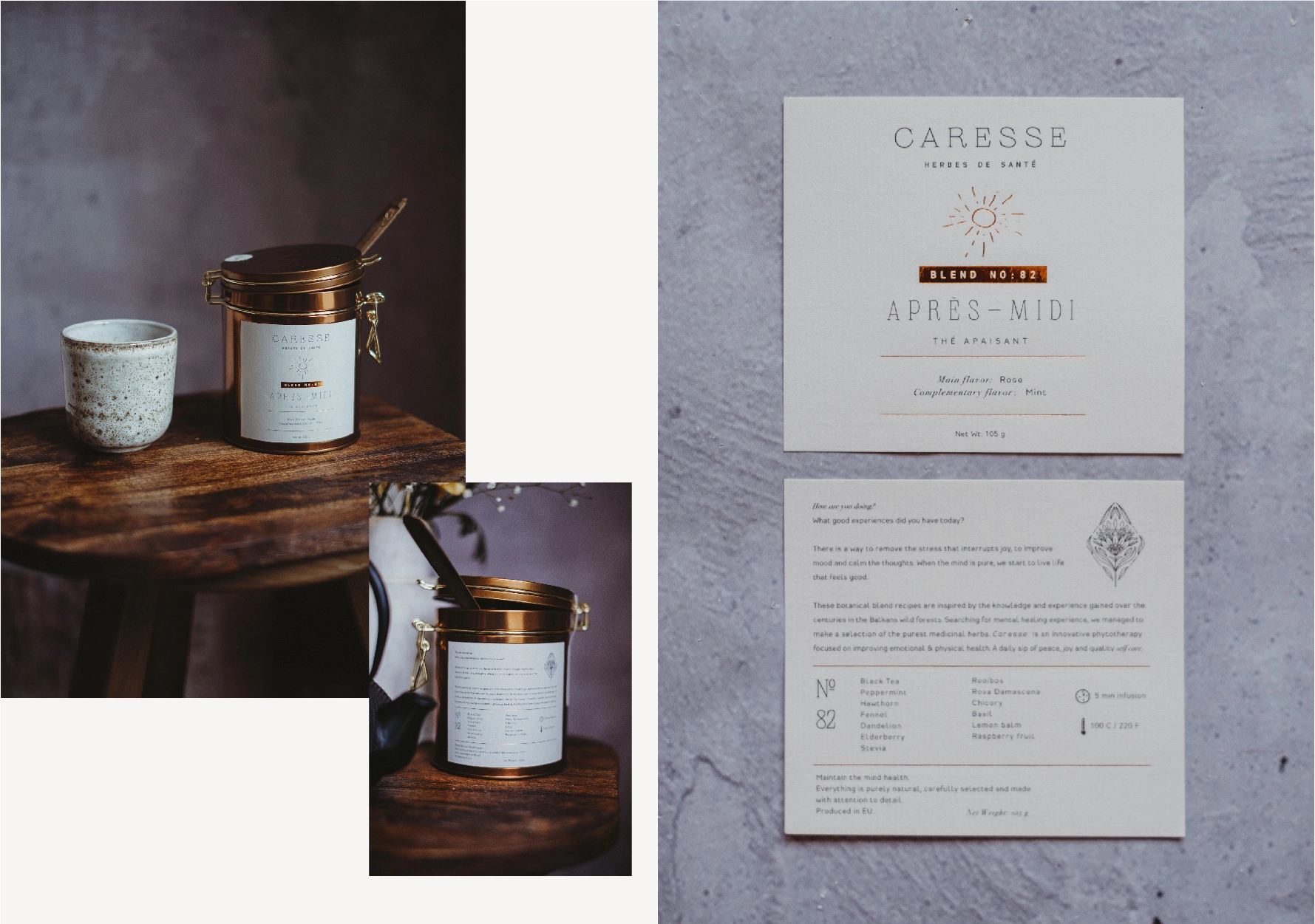 Caresse是一個(gè)草藥愛好者的小團(tuán)隊(duì),他們創(chuàng)造了三種創(chuàng)新的茶配方。使用的草藥在巴爾干山脈瘋狂生長(zhǎng)。產(chǎn)品具有卓越的治療特性和益處,可鎮(zhèn)靜和平衡情緒。該公司的靈感來(lái)自法國(guó)的“Savoir vivre”,我們將其理解為能夠過(guò)上好日子和智能享受的生活。該品牌將在法國(guó)市場(chǎng)推出。