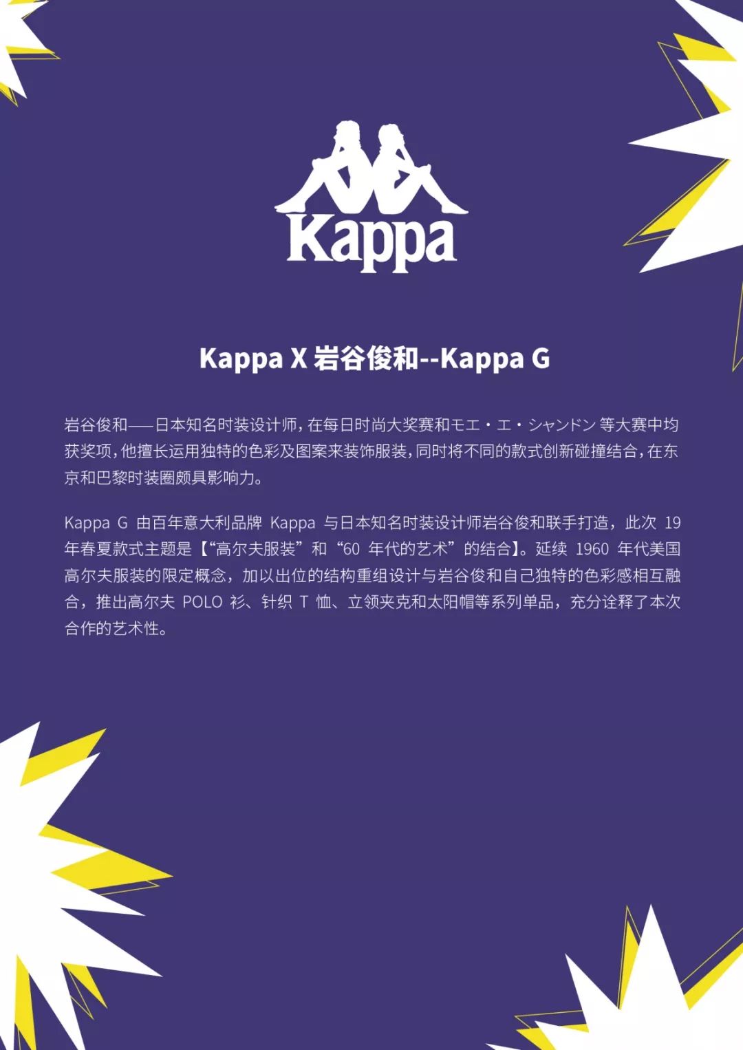 Kappa品牌于1916年在意大利誕生,早在20世紀(jì)6、70年代開(kāi)始便在歐洲嶄露頭角,隨后逐步發(fā)展為歐洲最具盛名的運(yùn)動(dòng)及休閑服裝品牌。而Kappa品牌所代表的運(yùn)動(dòng)、青春及熱情的生活方式,也早已隨著品牌極具識(shí)別度的品牌標(biāo)識(shí)——兩名背靠背而坐的男女為全世界所熟知。