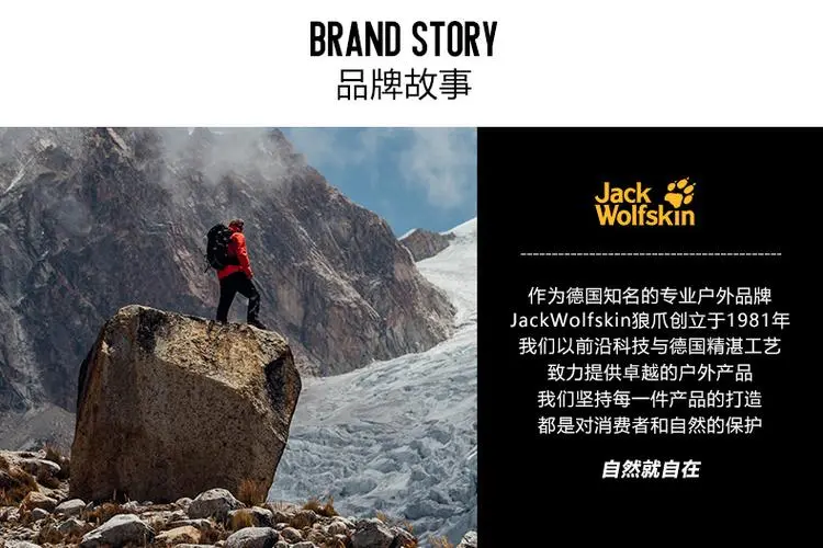 品牌寓意:品牌名Jack Wolfskin寓意對最高的產(chǎn)品要求和對野外最美好的向往,也意為大自然里最厲害的保護層。