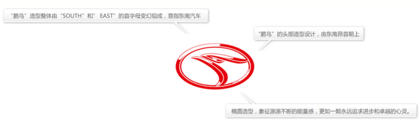 橢圓的形狀象征著源源不斷的能量感,更像是一個永遠追求進步和卓越的靈魂,“鵬鳥”的頭部造型設計,由東南昂首朝上,表現(xiàn)出振翅欲飛的態(tài)勢,表現(xiàn)出企業(yè)旺盛、強烈的進取心及能力,“鵬鳥”造型整體由“SOUTH”和”EAST”的首字母變幻組成,意指東南汽車。